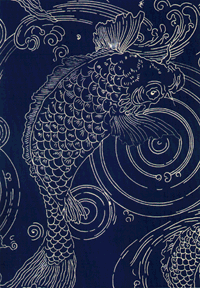 Japanese Carp on Linen Union Width: 54" Repeat: 23 1/2" Price: $50.00 per yard. Color: indigo print on white cloth