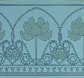 Small Lotus Frieze, 12" high, printed as two side-by-side borders on the paper (order 1/2 of the total length of border you need). Hand printed in New England. Documentary coloring of shades of teal blue. $25.00 per yard. |