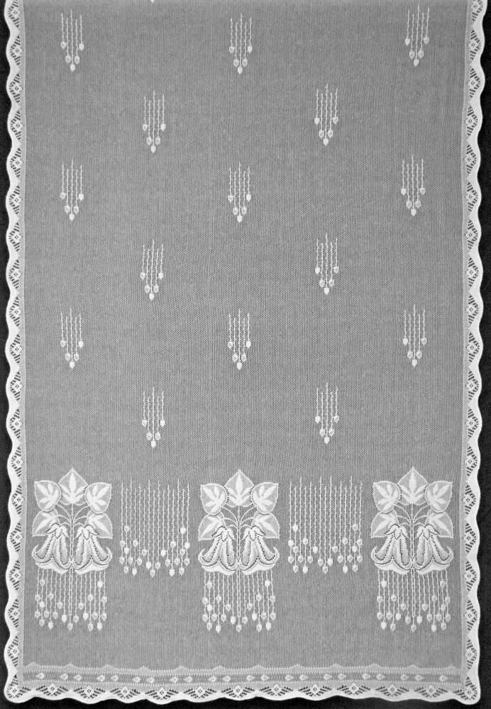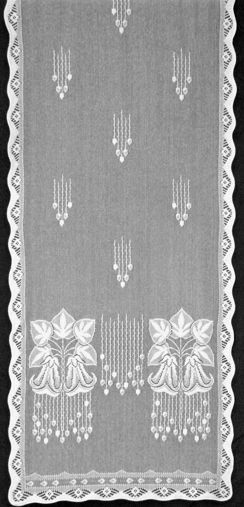 Meadow Lily marks its design centennial in 2010. Meadow Lily is especially well suited for American bungalows and early 20th century homes and apartments and works beautifully for any style of home where a clean, light lace pattern is desired. Our 8 point lace quality handsomely captures the conventionalized pattern of lilies and stamen. A low border has clusters of flowers (24" high) that enhance privacy and an open weave of the top of the panel that forms a transparent scrim.The original panel was advertised in the 1910-11 catalog of the Come-Pact Furniture Company of Ann Arbor, Michigan, in the 50" width. Burrows Studio has added a 30" width: the combination is ideal for homes with a variety of wide and narrow windows. A coordinating valance is also offered.