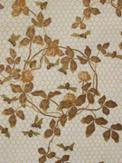 "Chrysanthemum", an English design. A pattern from c. 1890 of lacy leaves and flowers, this print has a delicate figure that rests gently on the wall. In style it is like a freely organized and simplified version of a design of William Morris, and the original artist certainly owed much to the inspiration of the great English designer. 21" wide with a self match repeat of 18". 6 yard long rolls, covering 30 square feet. Hand printed in New England. Offered with off white figure on a sage-ochre ground (the document coloring) and an off white figure on a rose ground. $60.00 per roll.
